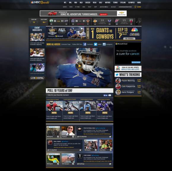 SNF ALL ACCESS (left) – Built central hub for all things SNF on NBCSports.com. Collaborated with marketing and design team to determine page elements and layout. Built using Drupal CMS, Spredfast and HTML/CSS.